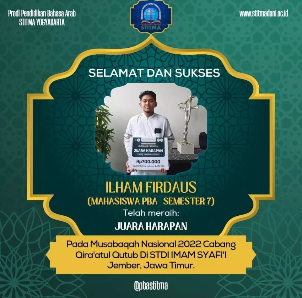 Pada hari Selasa tanggal 27 Desember 2022, Ilham Firdaus mahasiswa semester 7 program studi Pendidikan Bahasa Arab STITMA Yogyakarta meraih Read More …