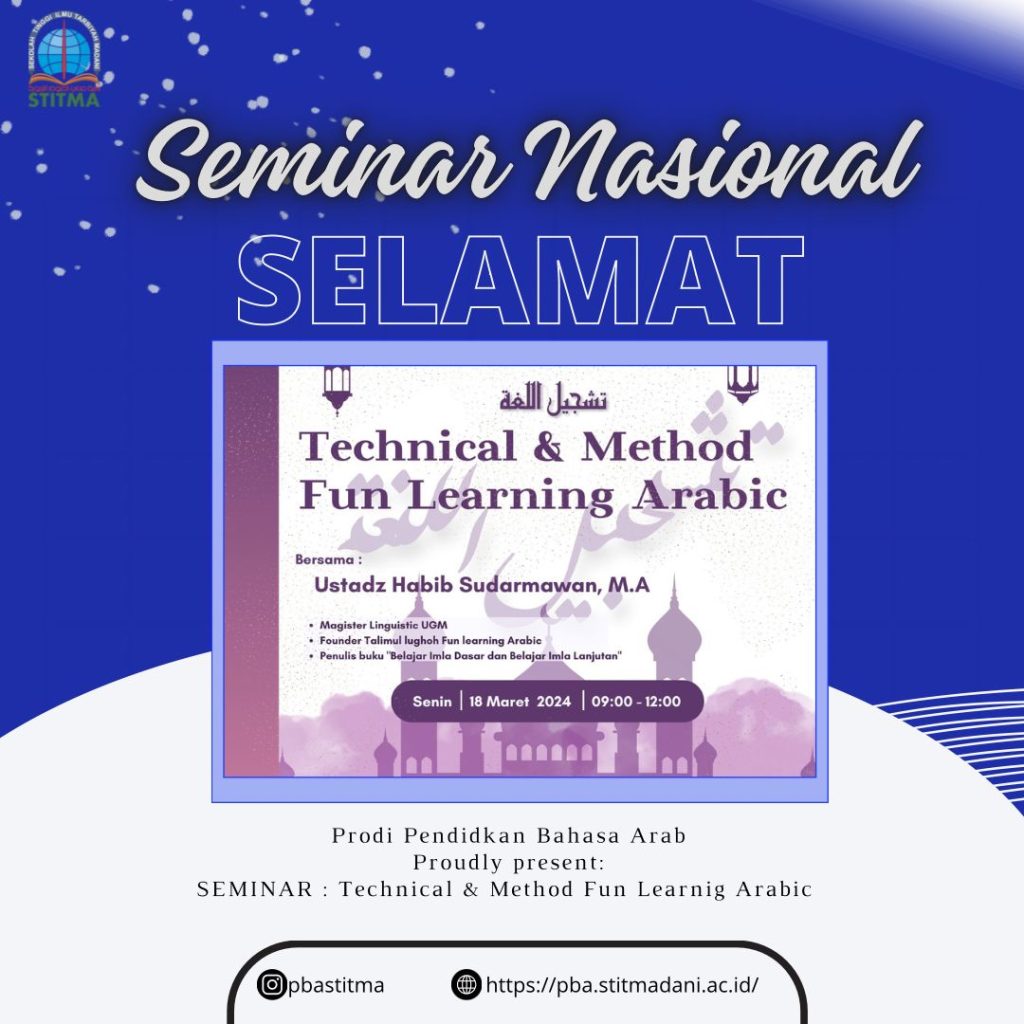 Pada hari Senin, tanggal 18 Maret 2024 Prodi Pendidikan Bahasa Arab STIT Madani Yogyakarta telah melaksanakan Seminar. “Metode Fun Learning untuk Pembelajaran Bahasa Arab” Seminar ini dilaksanakan secara langsung di aula kampus STIT Madani Yogyakarta, dan dihadiri seluruh mahasiswi. Adapun narasumber pada seminar ini yakni Ustadz Habib Sudarmawan, M.A.